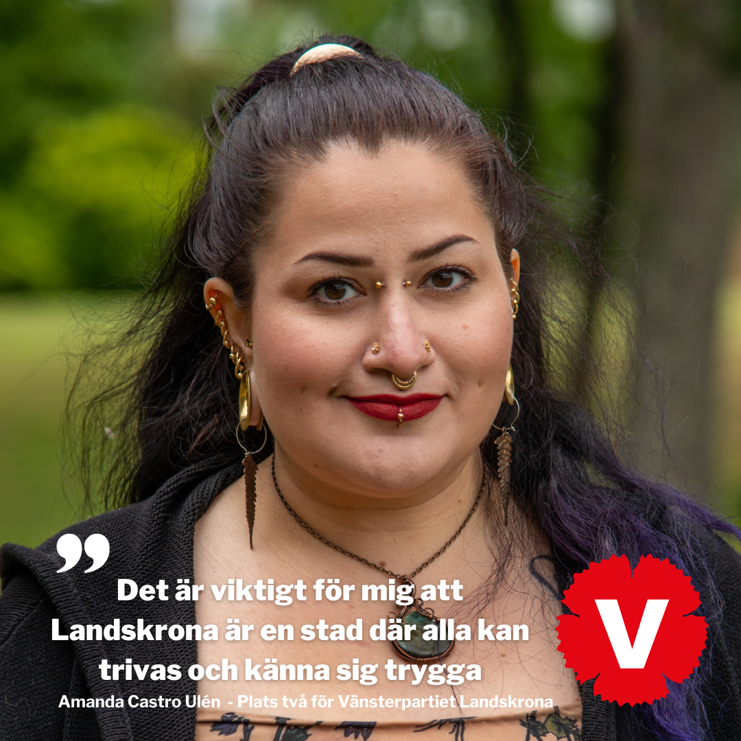 Amanda: Jag vill att alla ska ha samma möjligheter oavsett bakgrund och förutsättningar. Det är viktigt för mig att Landskrona är en stad där alla kan trivas och känna sig trygga. Det innebär fler hyresrätter och en mer inkluderande hyrespolicy, för att alla har rätt till en bostad. Satsningar på mer utsatta områden, för att minska segregationen. Tillgängliga fritidsaktiviteter för barn och ungdomar oavsett var i kommunen de bor. Jag tycker att mångfald är något vackert och dessutom viktigt för att utvecklas som samhälle, och jag hoppas på möjligheten att jobba för en bredare representation i beslutande organ inom kommunen. Det är också viktigt för mig att miljöfrågor inte blir klassfrågor. Därför vill jag bl.a jobba för en avgiftsfri kollektivtrafik.